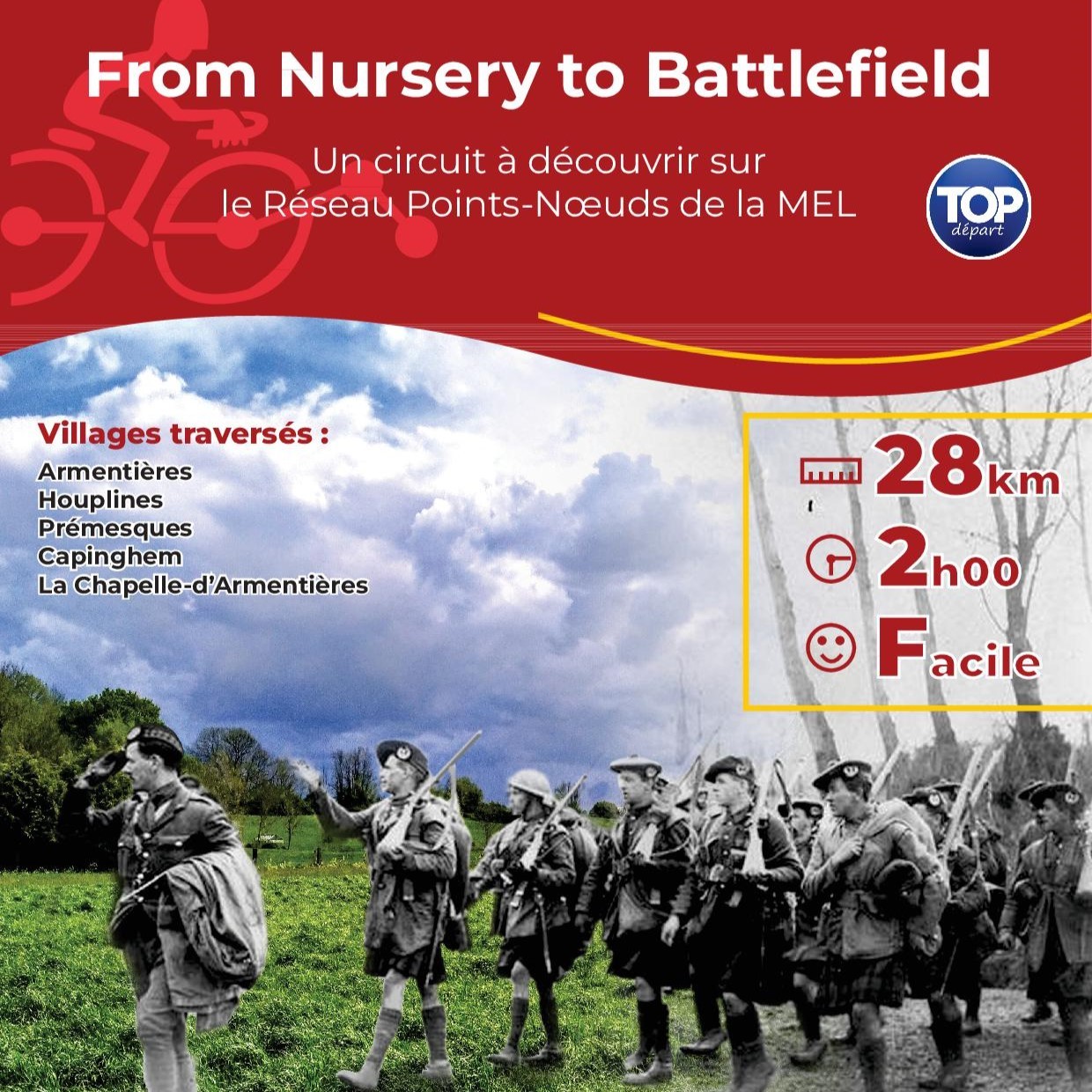 Situé entre zones de cantonnement et champ de bataille, le territoire de l’Armentiérois fut l’un des principaux témoins de la Grande Guerre. Au départ de la Gare d’Armentières, ce circuit vous entraine au plus près du front de 14-18 : ses monuments commémoratifs, ses cimetières militaires. Ce circuit permet également de découvrir le patrimoine architectural et paysager de l'Armentiérois et des belles campagnes de Capinghem et Prémesques : le Beffroi de l'Hôtel de Ville d'Armentières inscrit au Patrimoine Mondial de l'UNESCO, plusieurs édifices inscrits aux Monuments Historiques (l'ancienne École de Natation, l'ancien Magasin de commerce Mahieu, le Lycée Gustave Eiffel), le Fort d'Englos, le Petit Musée de la Gaufre à Houplines, les près du Hem le long de lys, de nombreuses possibilités de séjourner à proximité.