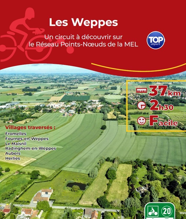 À l’Ouest de la Métropole Européenne de Lille, la ville fait place à la campagne. Ce circuit au départ du Musée de la Bataille de Fromelles est une invitation à la découverte : celle des champs, des villages fleuris, celle des paysages et des chemins fièrement marqués par les grands chapitres de la Première Guerre mondiale. Rouler dans les Weppes c’est profiter des bienfaits de la nature en s’enrichissant du passé. Le long des 36 km de ce circuits, vous pourrez notamment découvrir de nombreux cimetières et mémoriaux militaires dont deux inscrits au patrimoine de l'UNESCO (Pheasant Wood Military Cemetery et V.C. Corner Australian Cemetery), des Espaces Naturels et Boisés (Bois des Faisans, Parc de l'Abbiette, Parc des Saules), des étangs, de nombreuses églises et des œuvres de Street-Art et de nombreuses possibilités de séjourner à proximité.